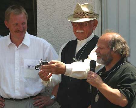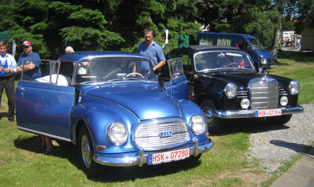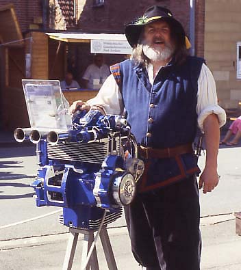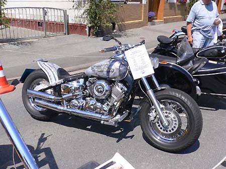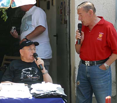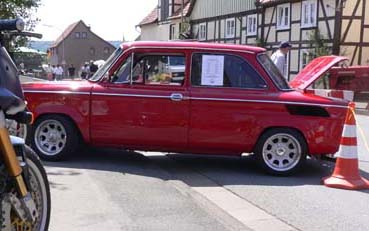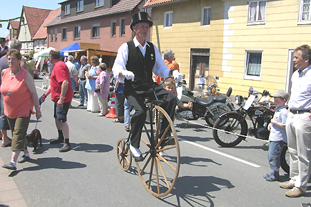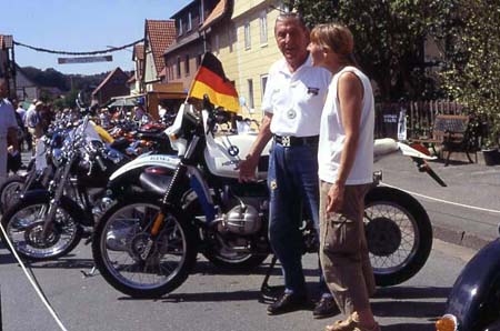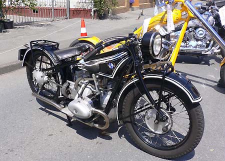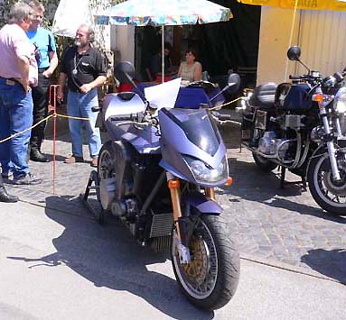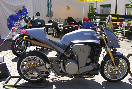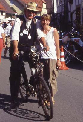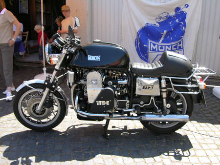 Aber längst nicht genug. Manfred Waikinat, einer der unermüdlichen Organisatoren, kam mit dem Wetterburger Reise- und Motorradjournalisten Winni Scheibe auf die Idee, eine Motorradausstellung mit dem Titel "Heiße Öfen - Gestern und Heute" auf die Räder zu stellen. Und weil Winni Scheibe zu den ausgewiesenen Münch-Kennern zählt, waren die Highlights schnell gefunden. Bernd Gehrken aus Bremen kam mit seinen beiden Münch-4 TTS und TTS-E, DBH aus Lüneburg stellte einen Münch-4 Schnittmotor zur Verfügung, Thomas Petsch aus Würzburg, Hersteller der sündhaft teuren Münch Mammut 2000 steuerte eine von nur 15 gebauten Maschinen sowie eine klassische Münch-4 TTS-E bei und Peter Kleine aus Bad Arolsen rollte mit seinem picobello restaurierten NSU Prinz TT auf das Gelände. |